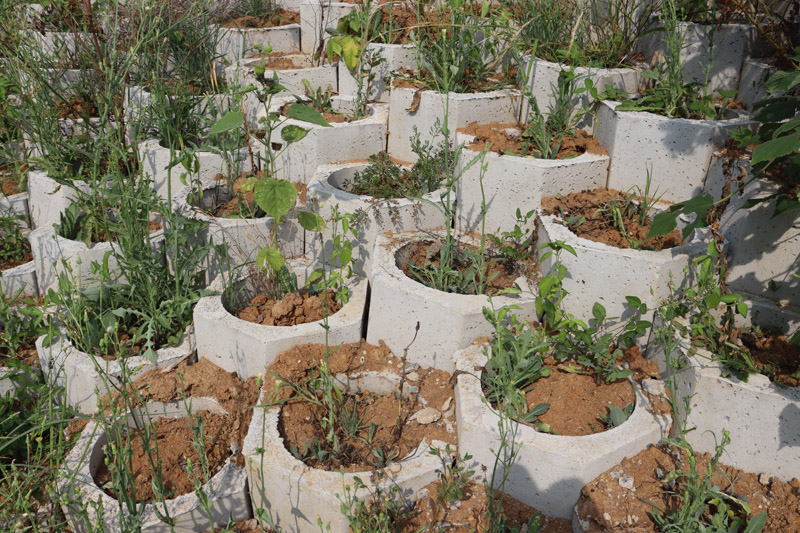 護坡砌塊鋪設完成后,將種植土填入護坡砌塊中,植物措施施工完畢后輕輕拍實。首次灌溉或降雨后砌塊內土壤發(fā)生沉降,以土壤表面低于上沿1~2cm為宜,有利于蓄水保土。對于靠近邊墻和趾墻的空檔,可以鋪礫石,以防土壤流失。