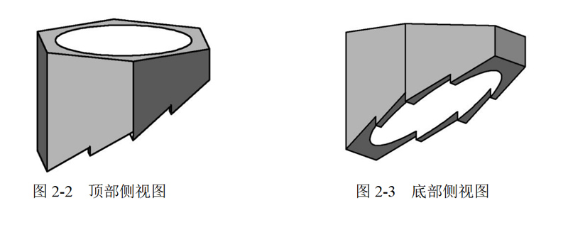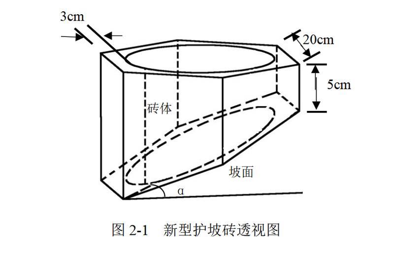 新型護坡砌塊為正六邊形,中空,內空部分為正六邊形或圓形,底端面與水平面成一夾角α,夾角α的大小與所護邊坡坡度相匹配(如圖2-1),這樣,在坡面鋪設護坡砌塊時,護坡砌塊底部也與坡面相吻合,上端能夠保持水平,確保砌塊內土體的表面保持水平穩(wěn)定狀態(tài),最大程度地保持土壤。